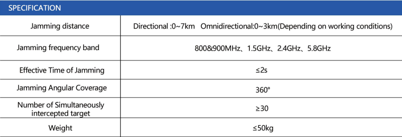 Jamming Suppression Device utilizes white noise narrowband swept frequency jamming technique.adopting an intelligent and efficient method of suppressing jamming to disrupt the reception and pro.cessing of image transmission, remote control, and navigation signals of drones within a designatedrange, This achieves countermeasures such as forced return, forced landing, and expulsion, enablingrapid and effective disposal of the target drone. The equipment is guided by radar, radio, and otherdevices to emit signals, achieving the desired jamming effect on the target.